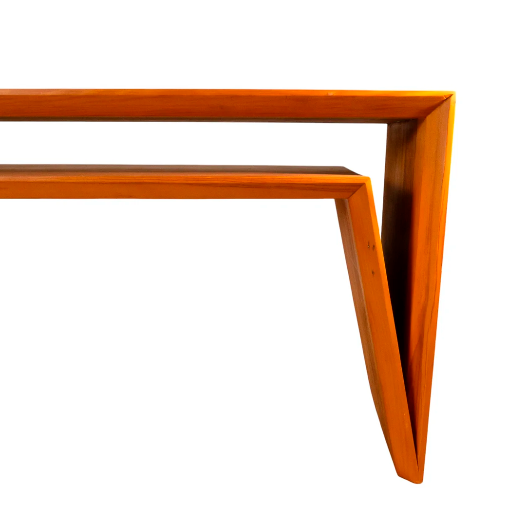 Conceito: Linhas retas e volumetria sólida que destacam a beleza natural da madeira.