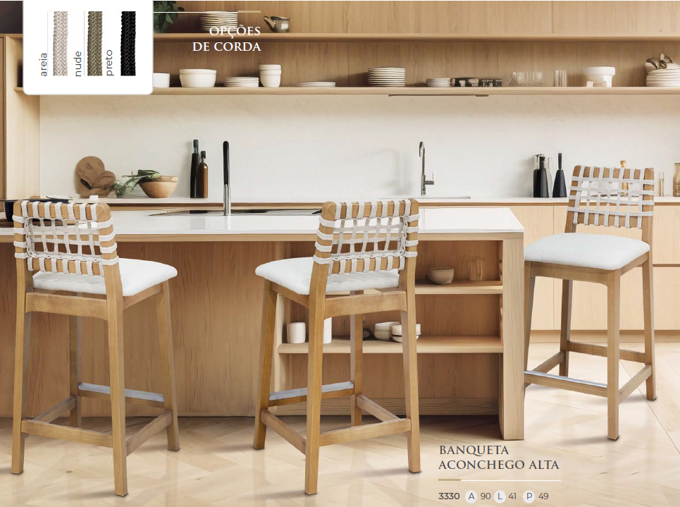 Confira suas medidas aconchegantes, pensadas para garantir o conforto da sua família e amigos. A Banqueta Aconchego combina elegância e bem-estar, com estofamento acolhedor e acabamento em corda náutica trançada à mão. Ideal para cozinhas, varandas e áreas de convivência, une charme, resistência e praticidade, transformando momentos cotidianos em experiências únicas.