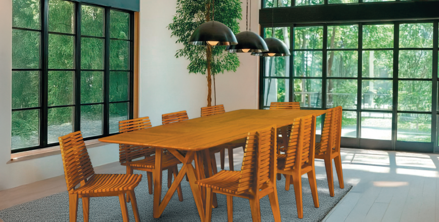 Produzida em madeira de demolição selecionada, reaproveitando espécies nobres como Peroba Rosa, Ipê e Angelim.
