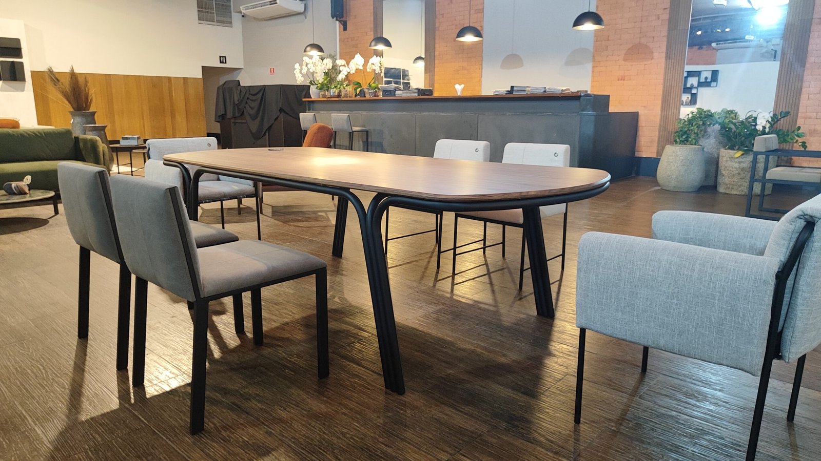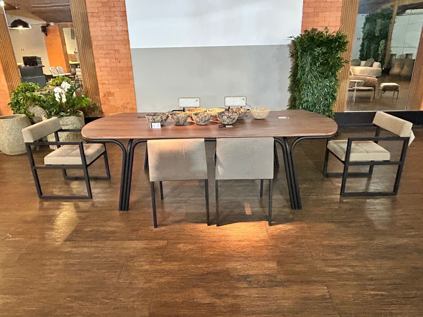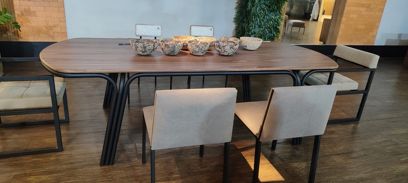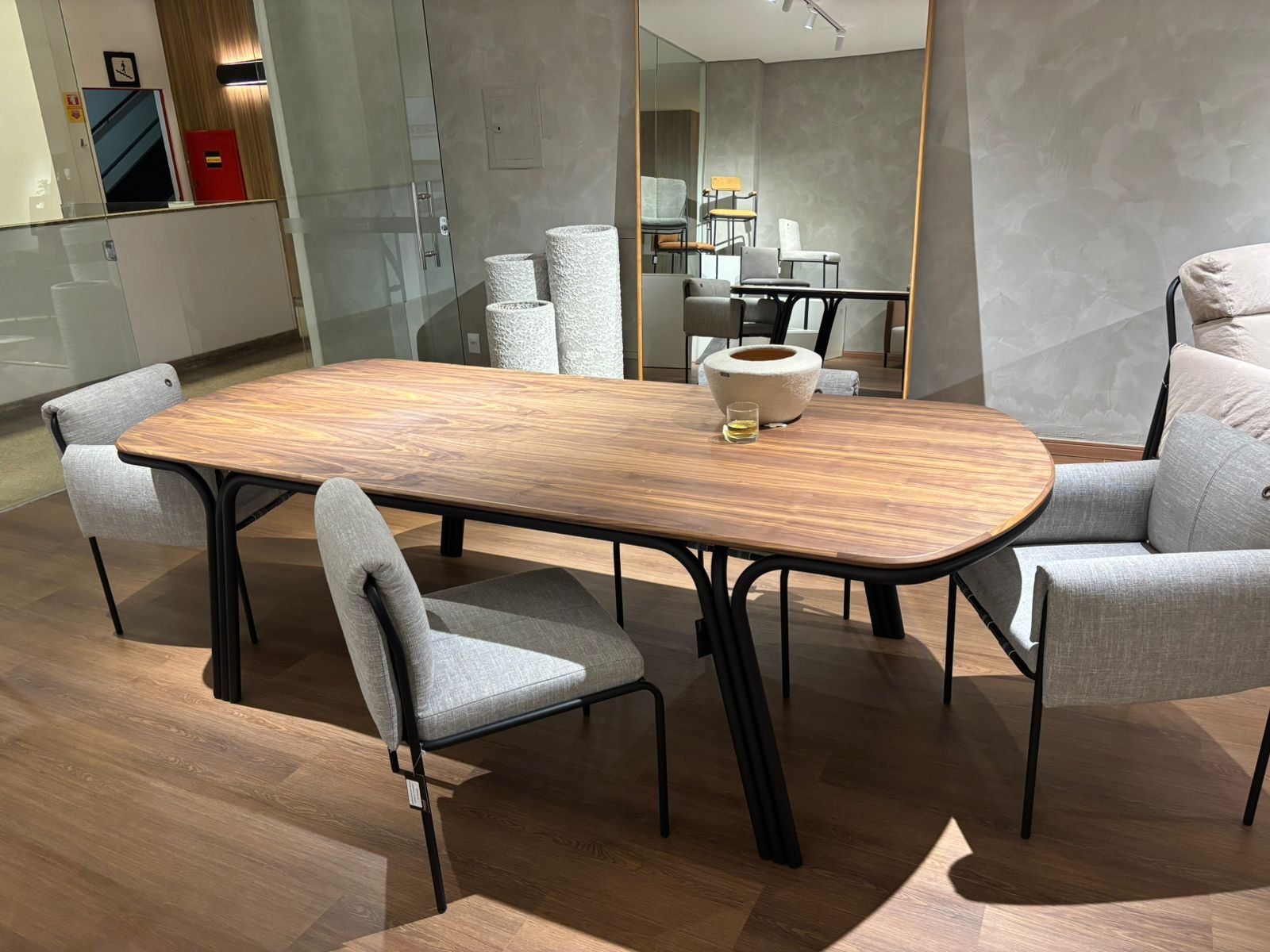 Mesa de jantar com design contemporâneo, caracterizada pelo equilíbrio entre materiais naturais e estrutura metálica. Desenvolvida para ambientes residenciais que valorizam proporção, presença visual e acabamento de alto padrão.
