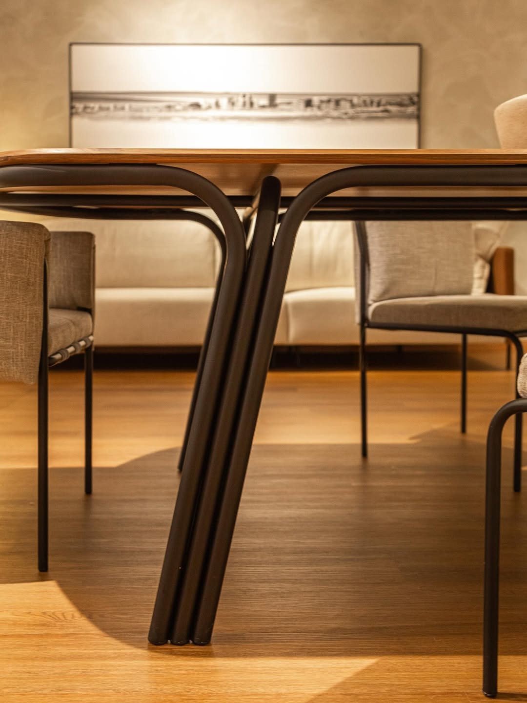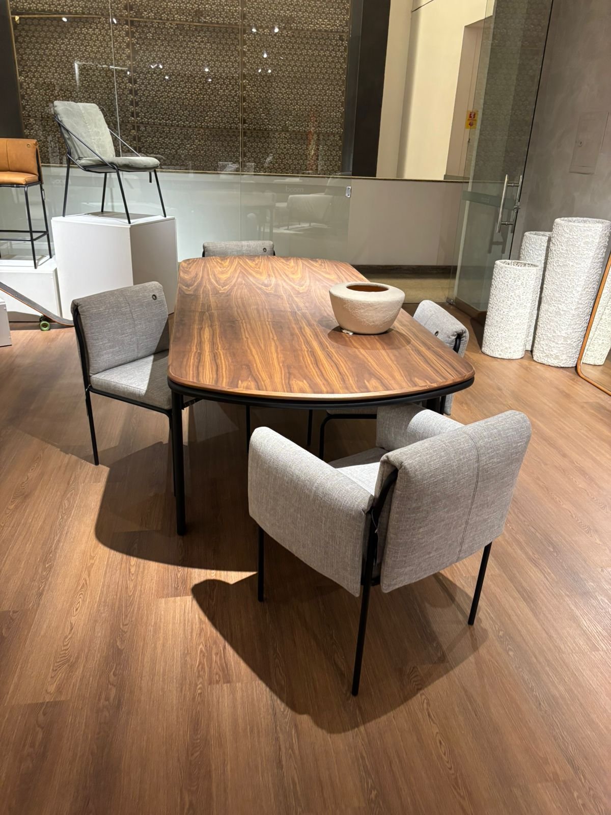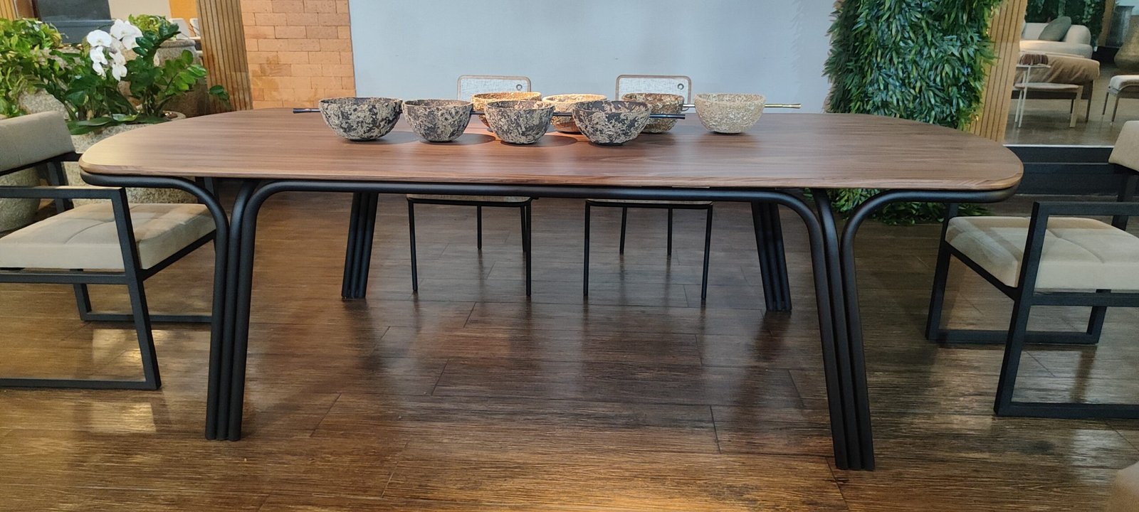 Mesa de jantar com design contemporâneo, caracterizada pelo equilíbrio entre materiais naturais e estrutura metálica. Desenvolvida para ambientes residenciais que valorizam proporção, presença visual e acabamento de alto padrão.