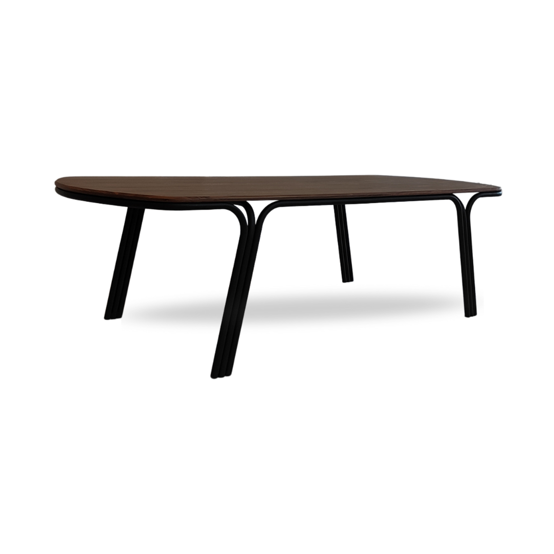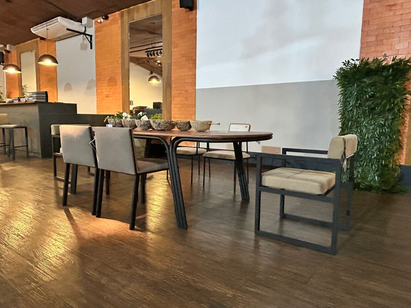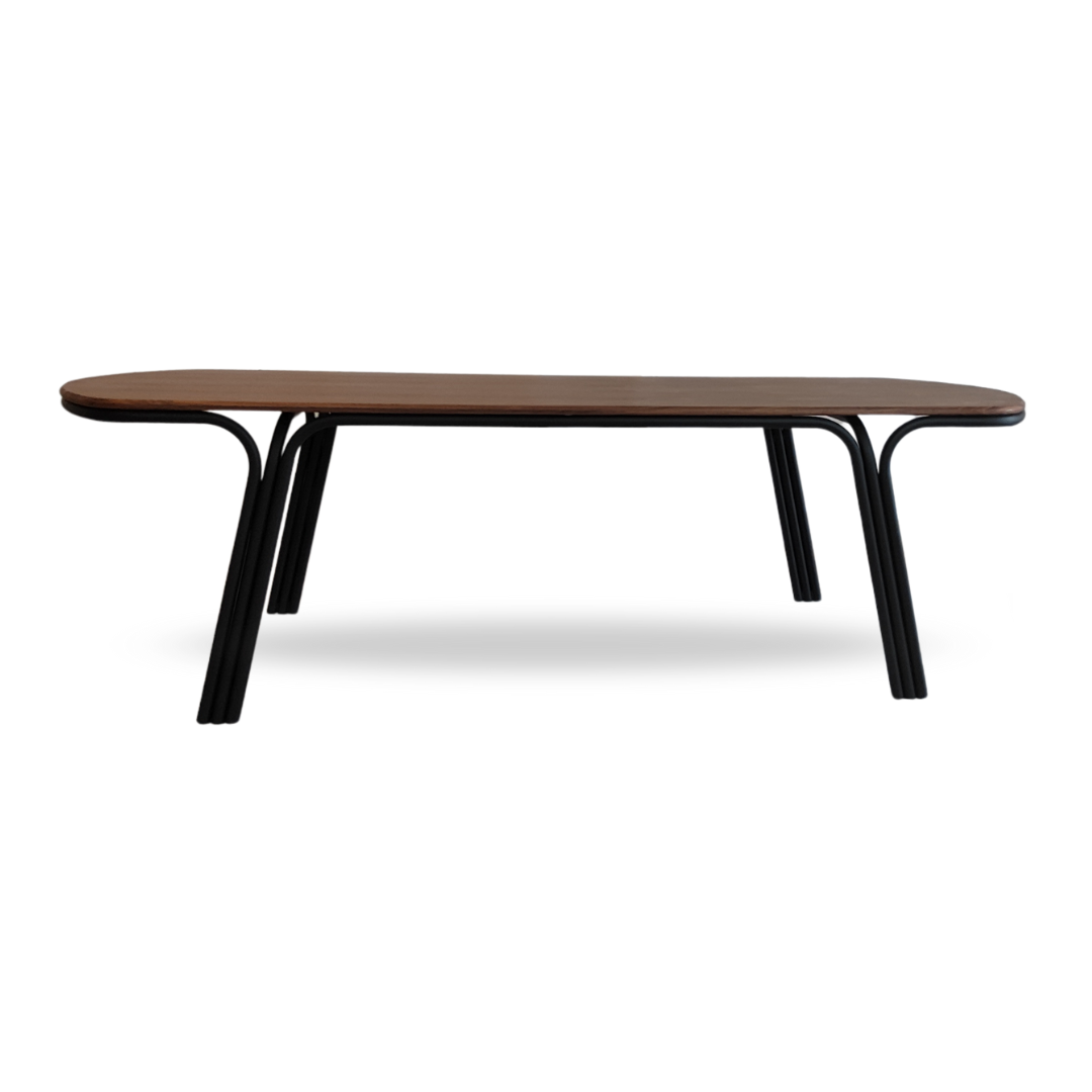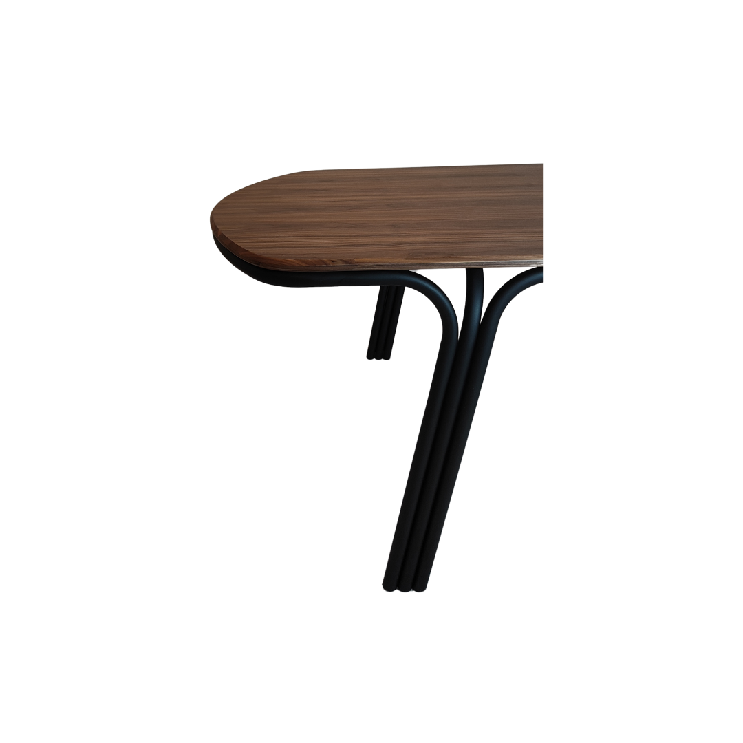 Mesa de jantar com design contemporâneo, caracterizada pelo equilíbrio entre materiais naturais e estrutura metálica. Desenvolvida para ambientes residenciais que valorizam proporção, presença visual e acabamento de alto padrão.