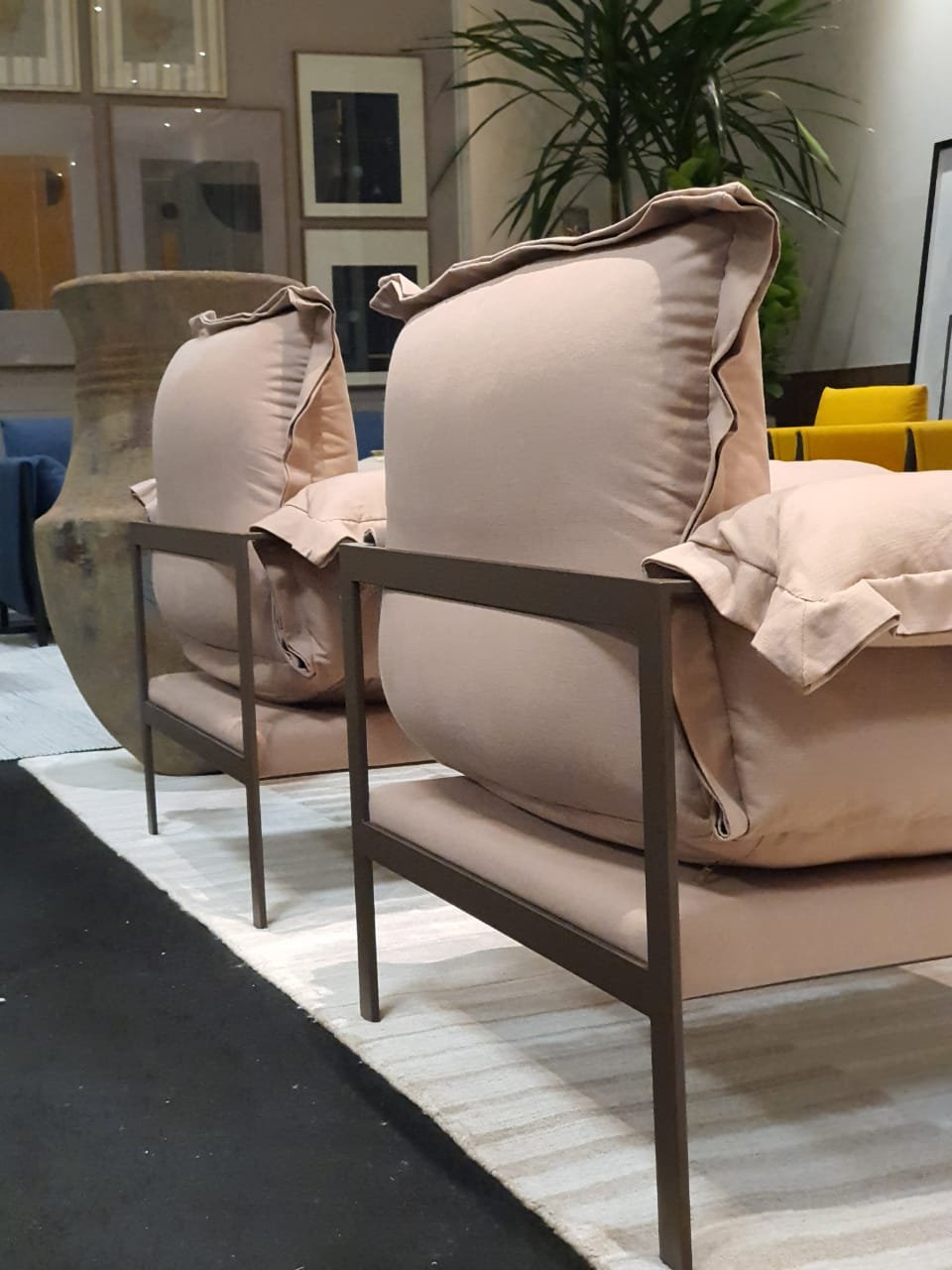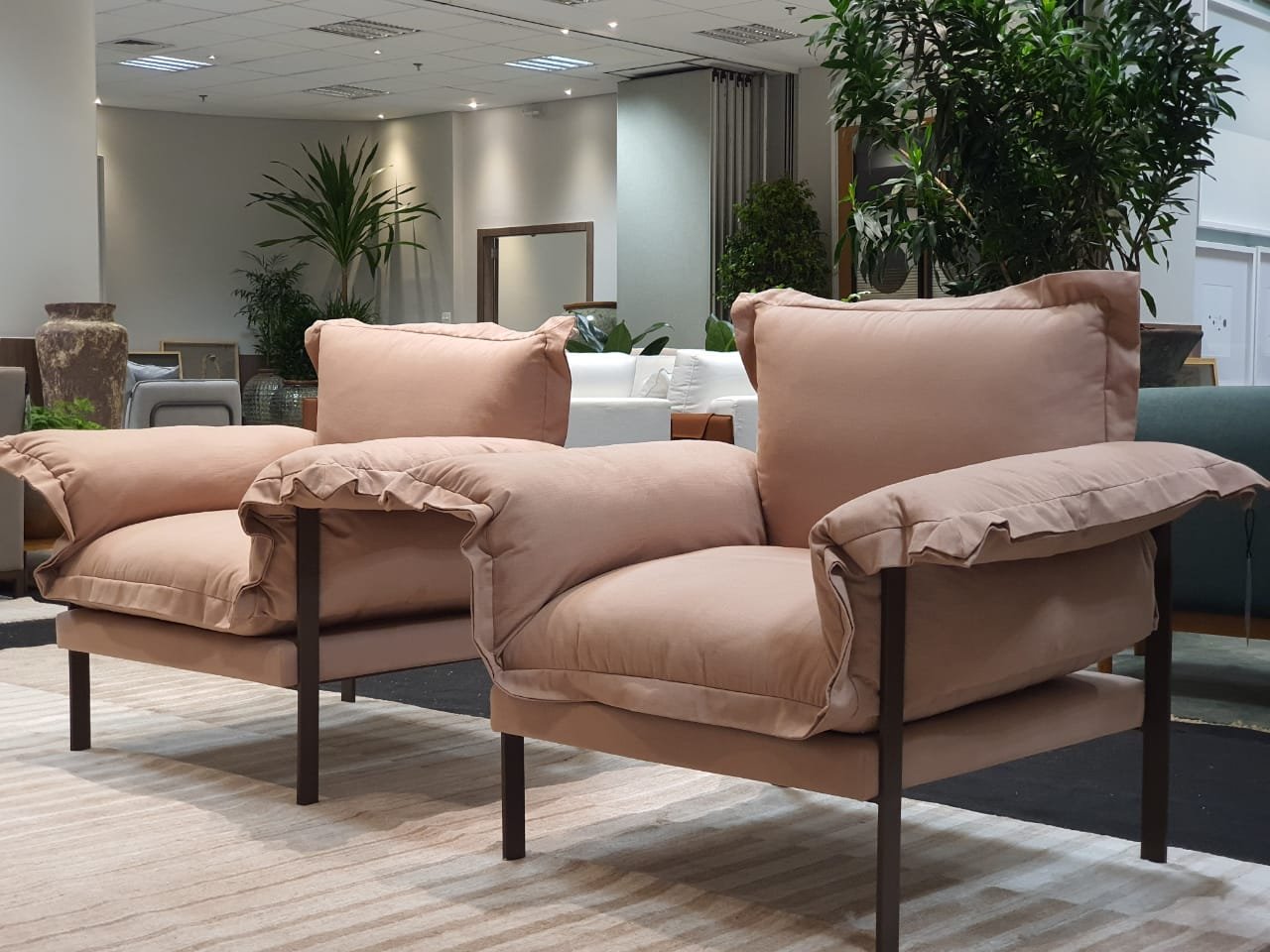 A Poltrona Happy destaca-se pelas almofadas de assento e braços com volumetria marcante, valorizando o design contemporâneo do ambiente.