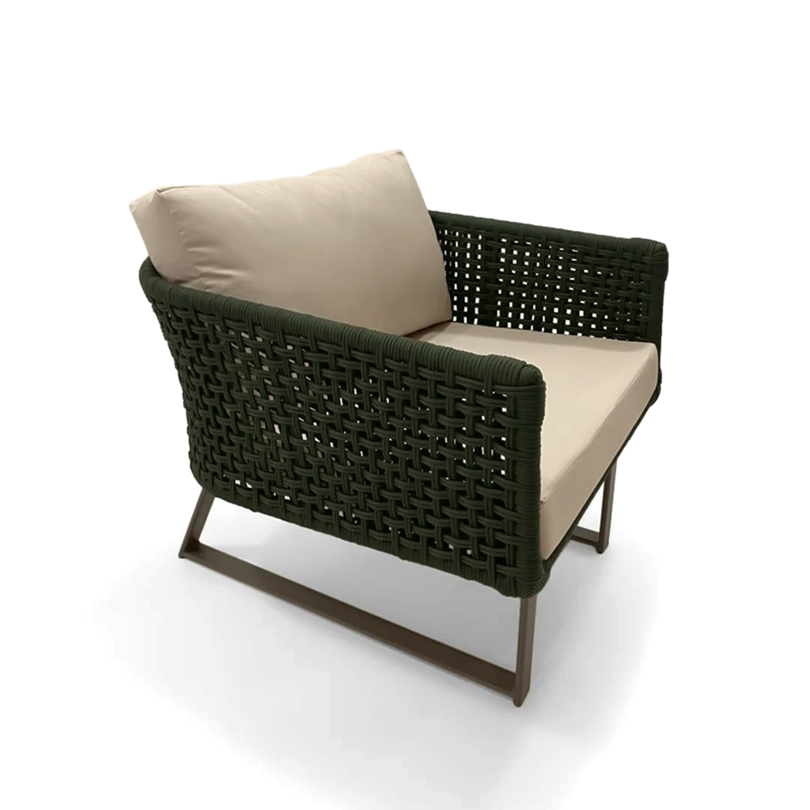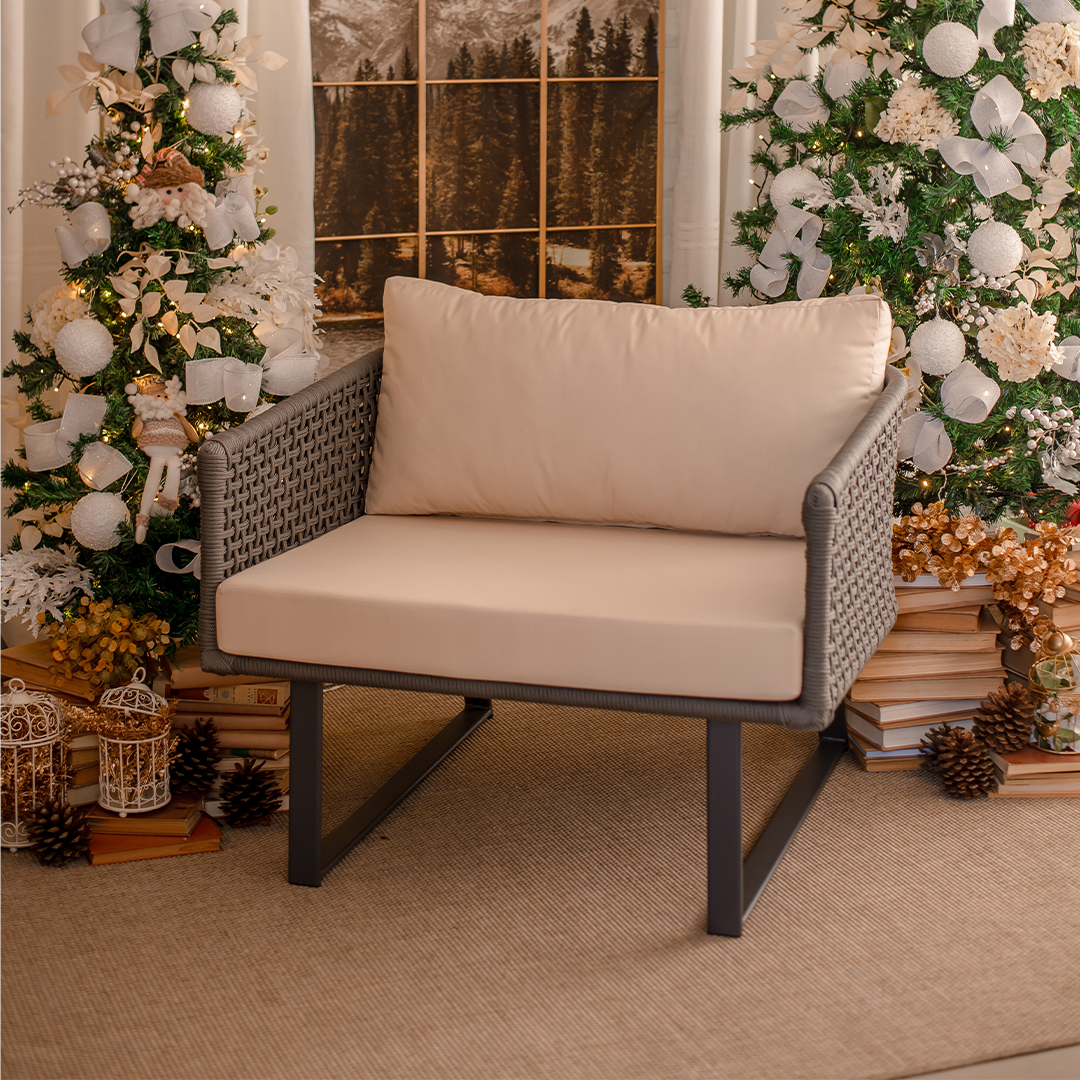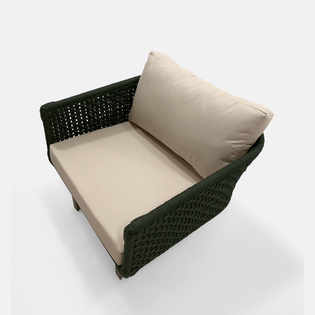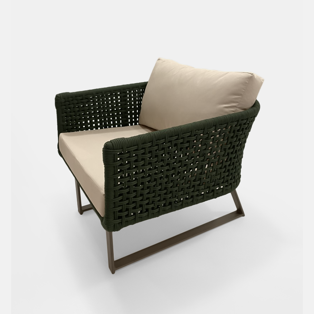 Poltrona Marina é a combinação perfeita entre estilo e funcionalidade para áreas externas. Sua estrutura em alumínio tubular com pintura eletrostática garante leveza e resistência à oxidação, enquanto o tecimento em corda náutica com proteção UV proporciona durabilidade. As almofadas em tecido impermeável trazem praticidade, com assento em espuma de alta densidade e encosto macio em flocos de espuma, oferecendo aconchego, conforto e elegância em varandas, jardins, piscinas e espaços gourmet.