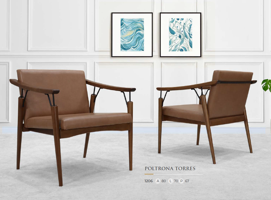 Poltrona Torres une charme e resistência, com estrutura em madeira maciça de eucalipto e detalhes em metal. Seu design exclusivo combina durabilidade e sofisticação, valorizando ambientes diversos. Confortável e imponente, traz presença e elegância, destacando-se pela qualidade e acabamento impecável.