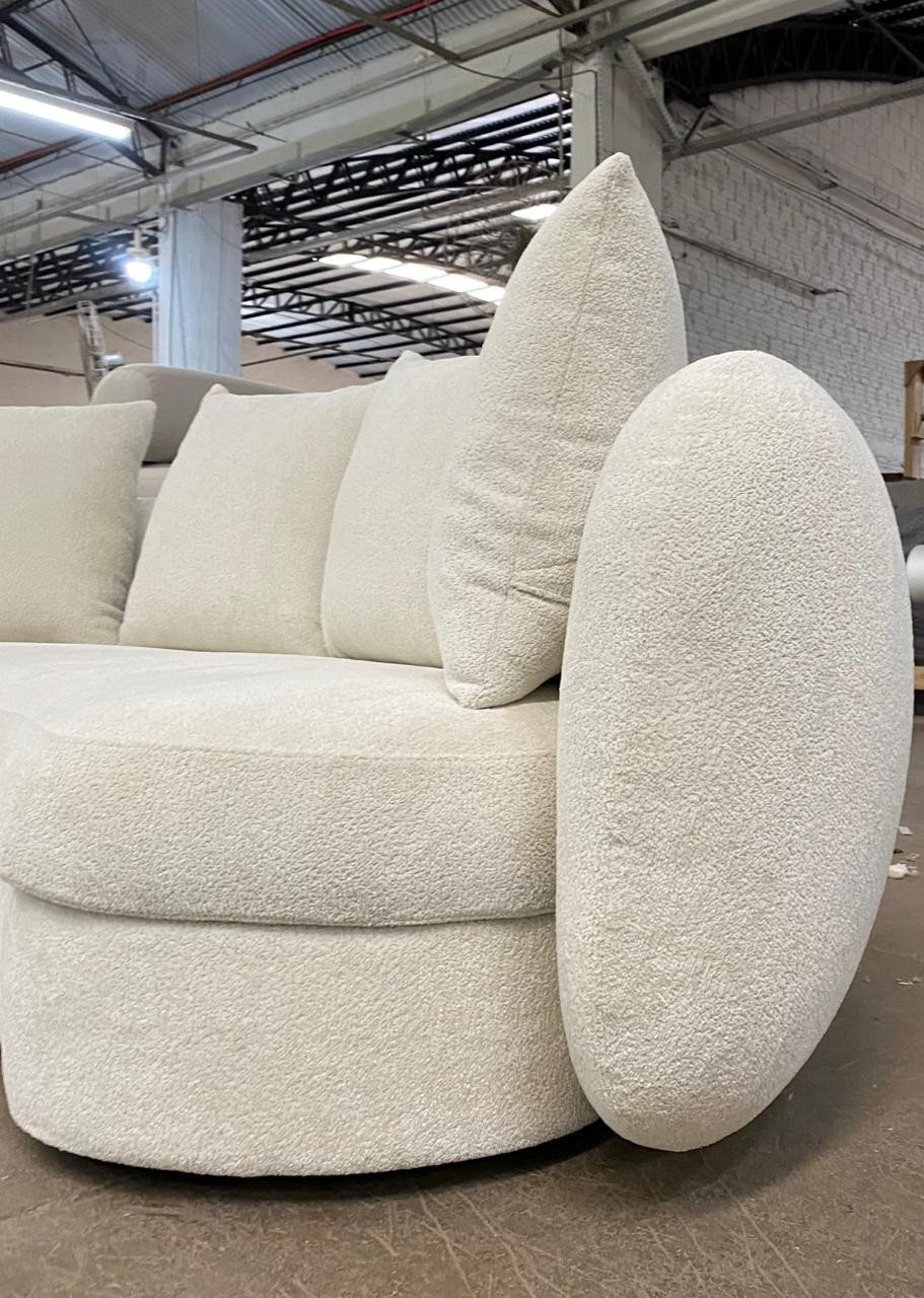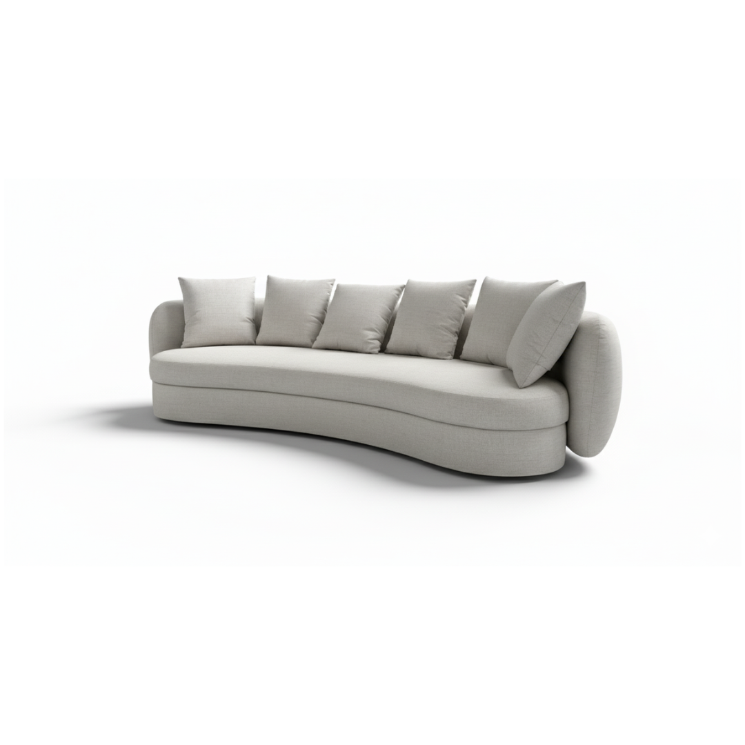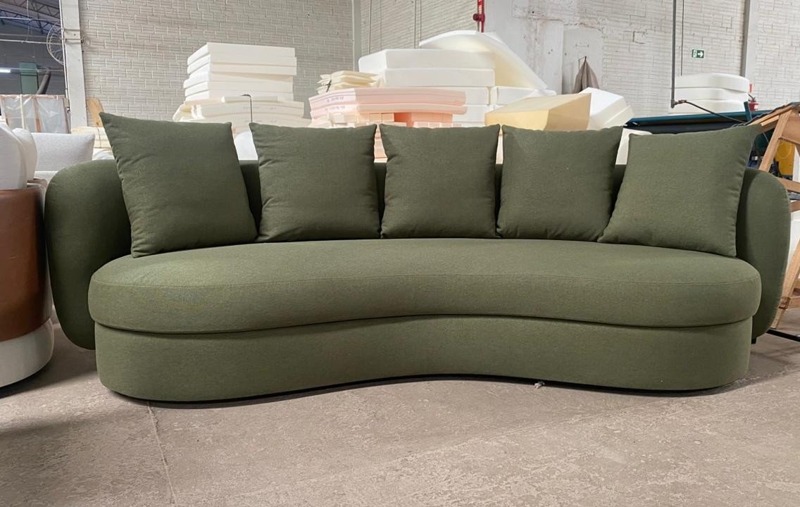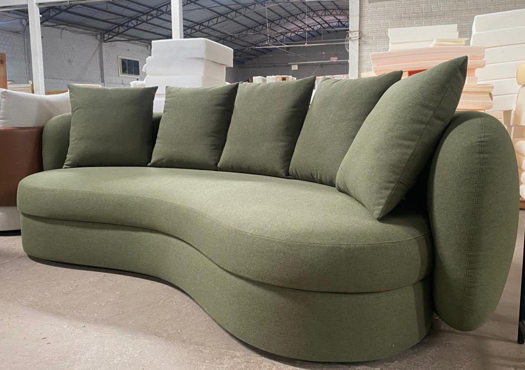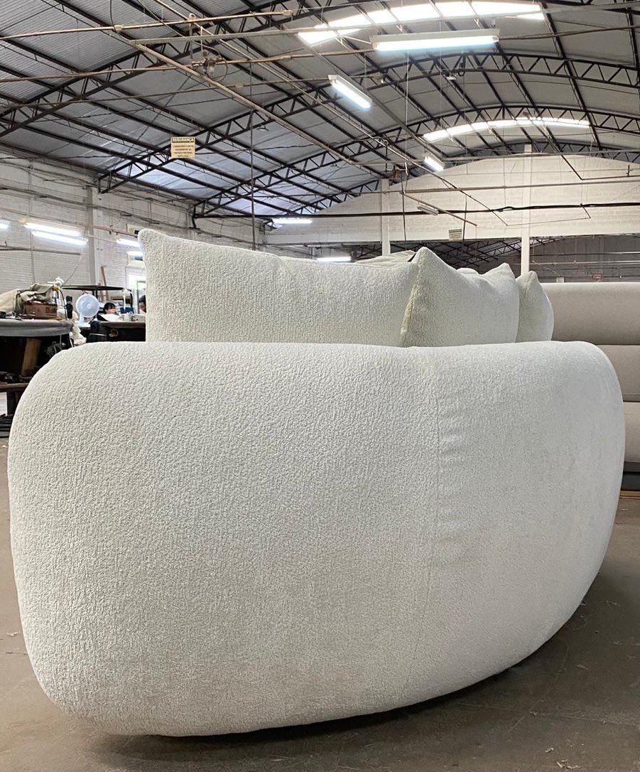 O Sofá Lugo apresenta design orgânico com contorno marcante, caracterizado por curvas contínuas e formas arredondadas que se estendem inclusive para as costas. Seu desenho escultural valoriza o ambiente, oferecendo conforto estrutural aliado a uma estética contemporânea e fluida.
